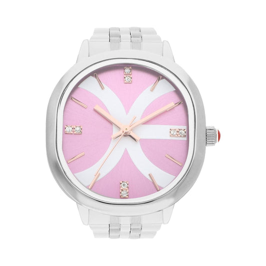 Reloj Analogo para Dama con Pedreria en Indicadores, Fondo Rosa y Extensible Color Plateado OE2440