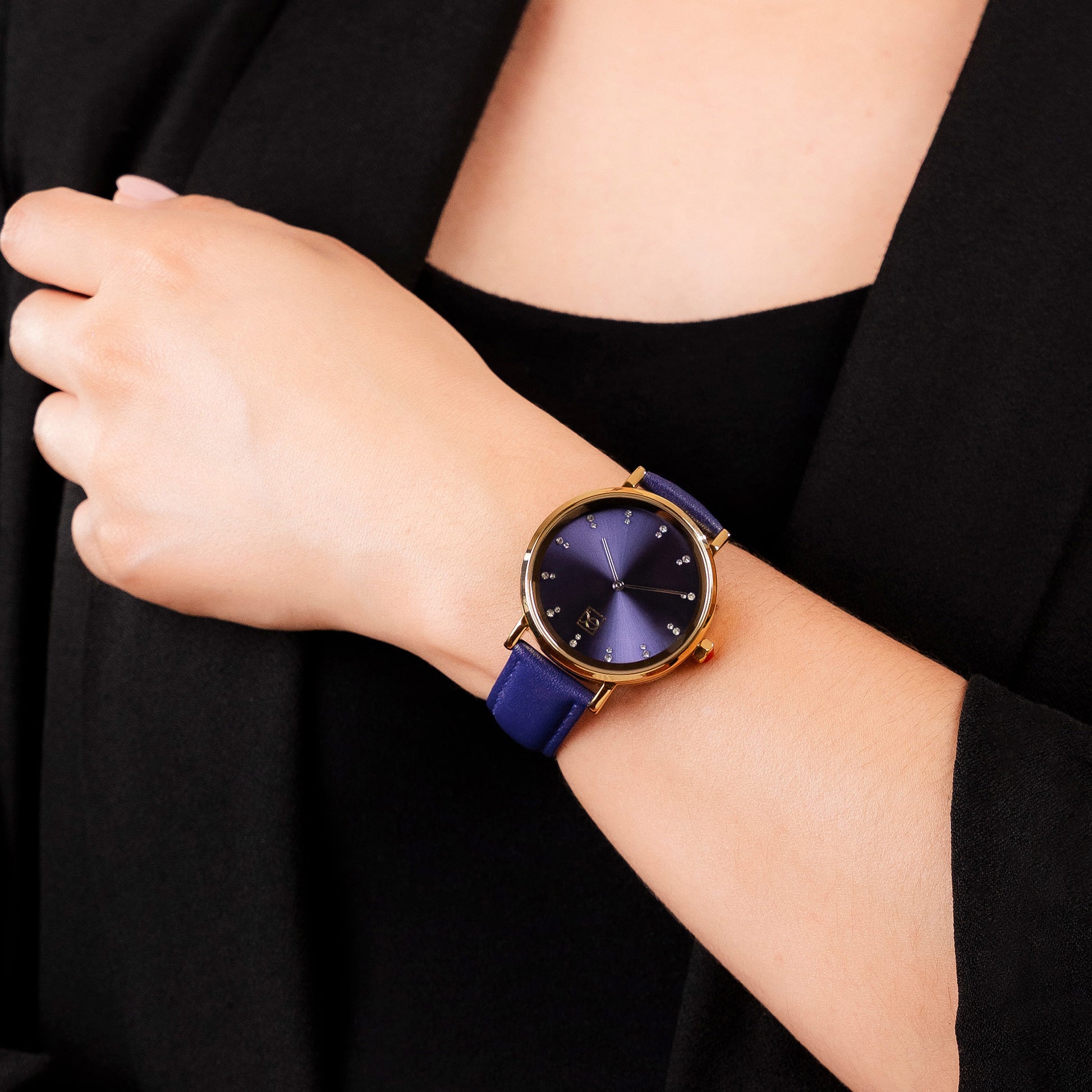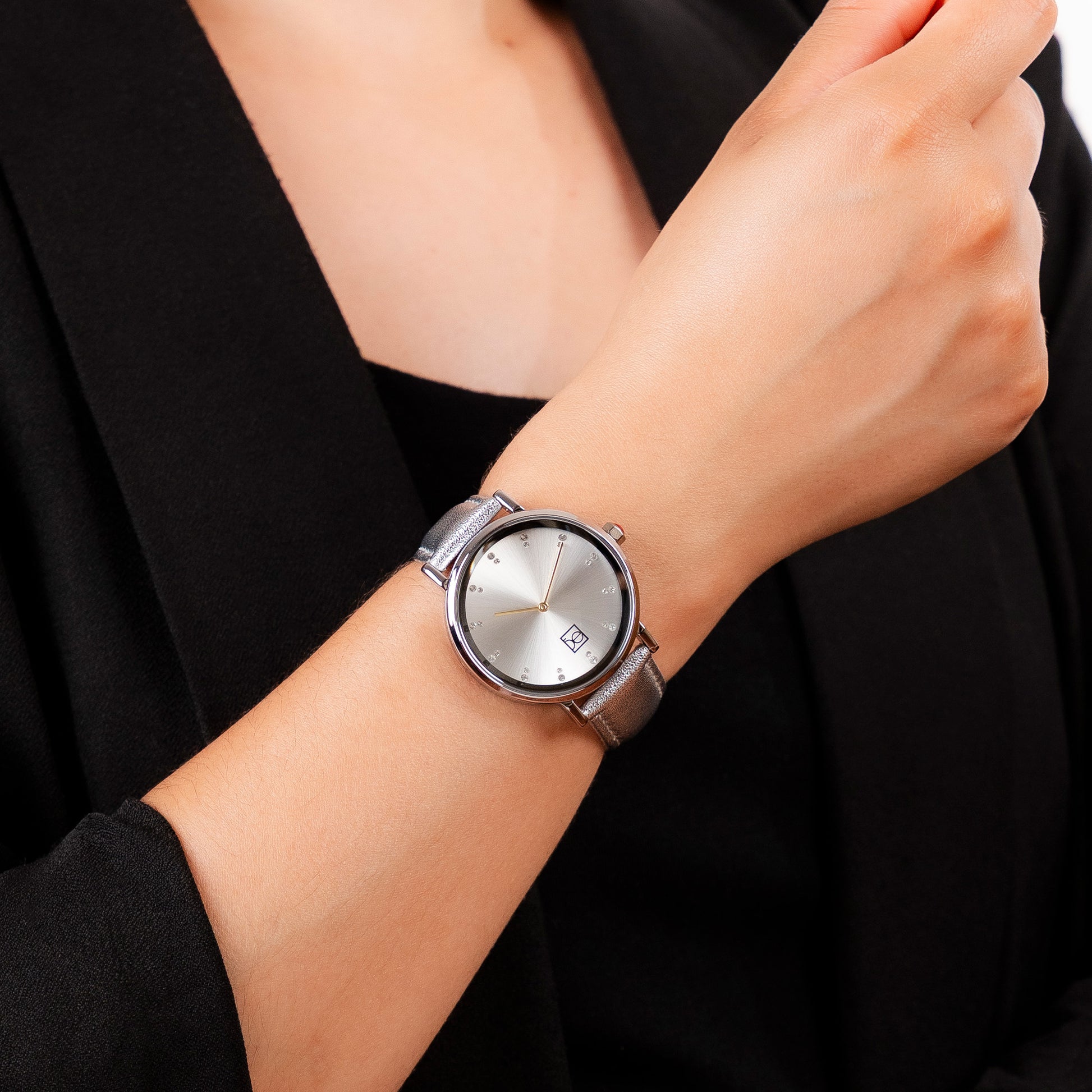 Este reloj Cloe combina una carátula limpia con delicados indicadores en pedrería. La correa aporta un toque único a cualquier look, sin perder la elegancia.